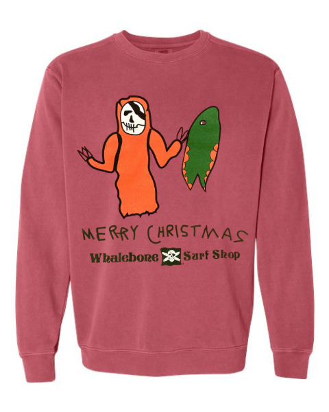When the cutest lil Whalebone customer comes in to deliver a handrawn Christmas card, you turn it into a festive Whalebone design. Introducing the Bone Xmas design on a crimson Unisex Garment-Dyed Crewneck Sweatshirt.